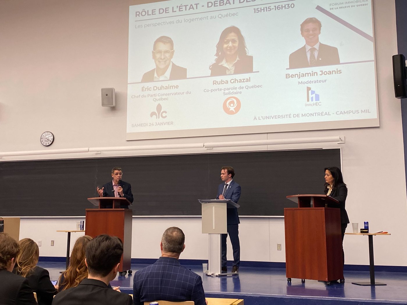 Les deux politiciens à l'opposé de l'échiquier politique ont débattu sur un ton cordial, dans le cadre du Forum de la relève immobilière, un événement organisé par un groupe d'étudiants de HEC Montréal, ImmoHEC.