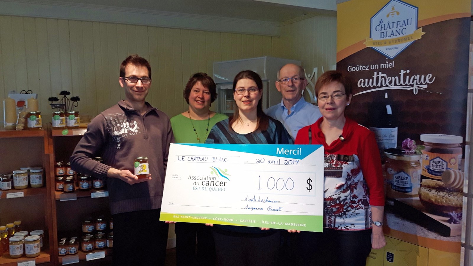 Afin d’apporter son appui aux personnes touchées par le cancer, Le Château Blanc, apiculture inc. s’allie fièrement, pour une seconde année, à l’Association du cancer de l’Est du Québec. L’entreprise s’engage à verser 0,50 $ à l’organisme 100 % régional pour chaque pot de miel d’été vendu (de format 500 g et étiqueté Miel de l’Est). Le produit sera facilement identifiable dans les points de vente de l’Estdu-Québec grâce à l’ajout, sur l’emballage, d’une pastille aux couleurs de l’Association.